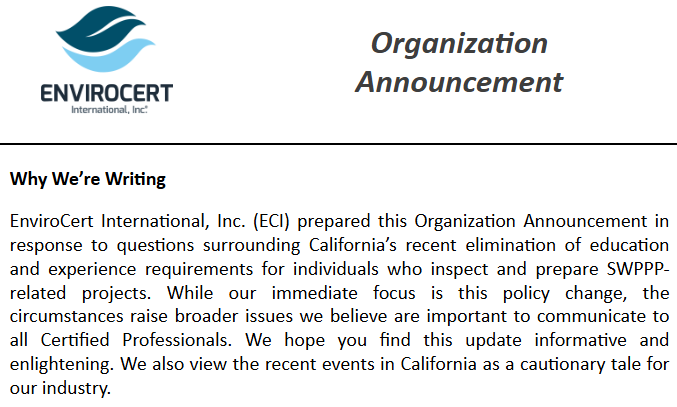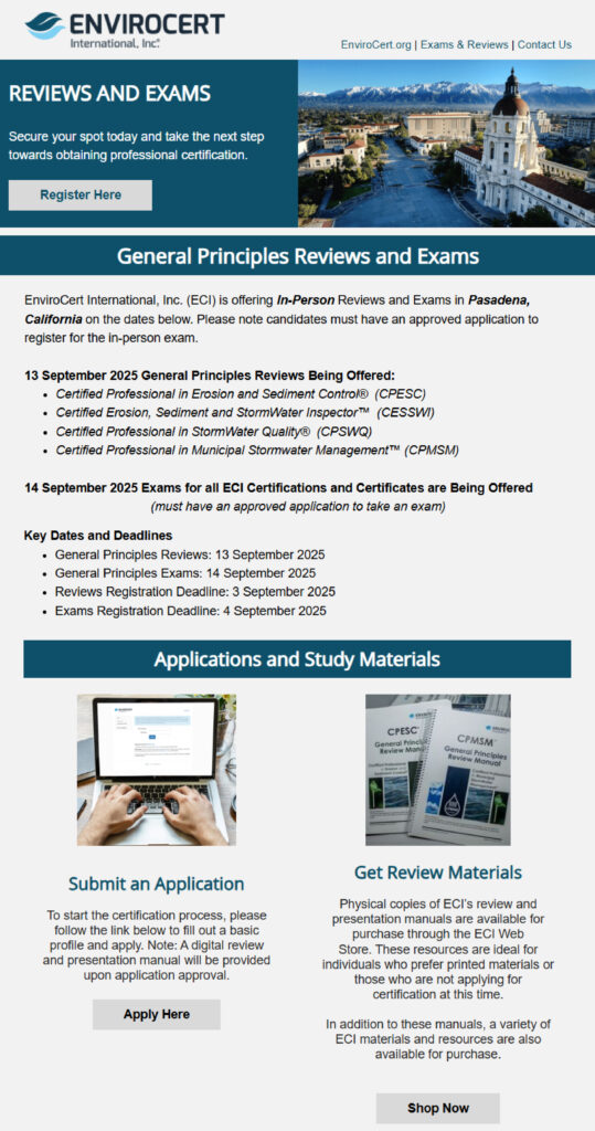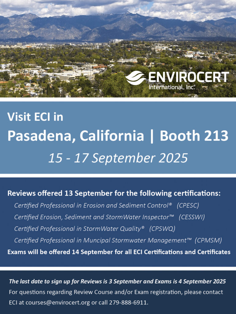 News ECI LAUNCHES AN INSTALLATION OF EROSION AND SEDIMENT CONTROL PROFESSIONAL CERTIFICATION Read More » August 26, 2025