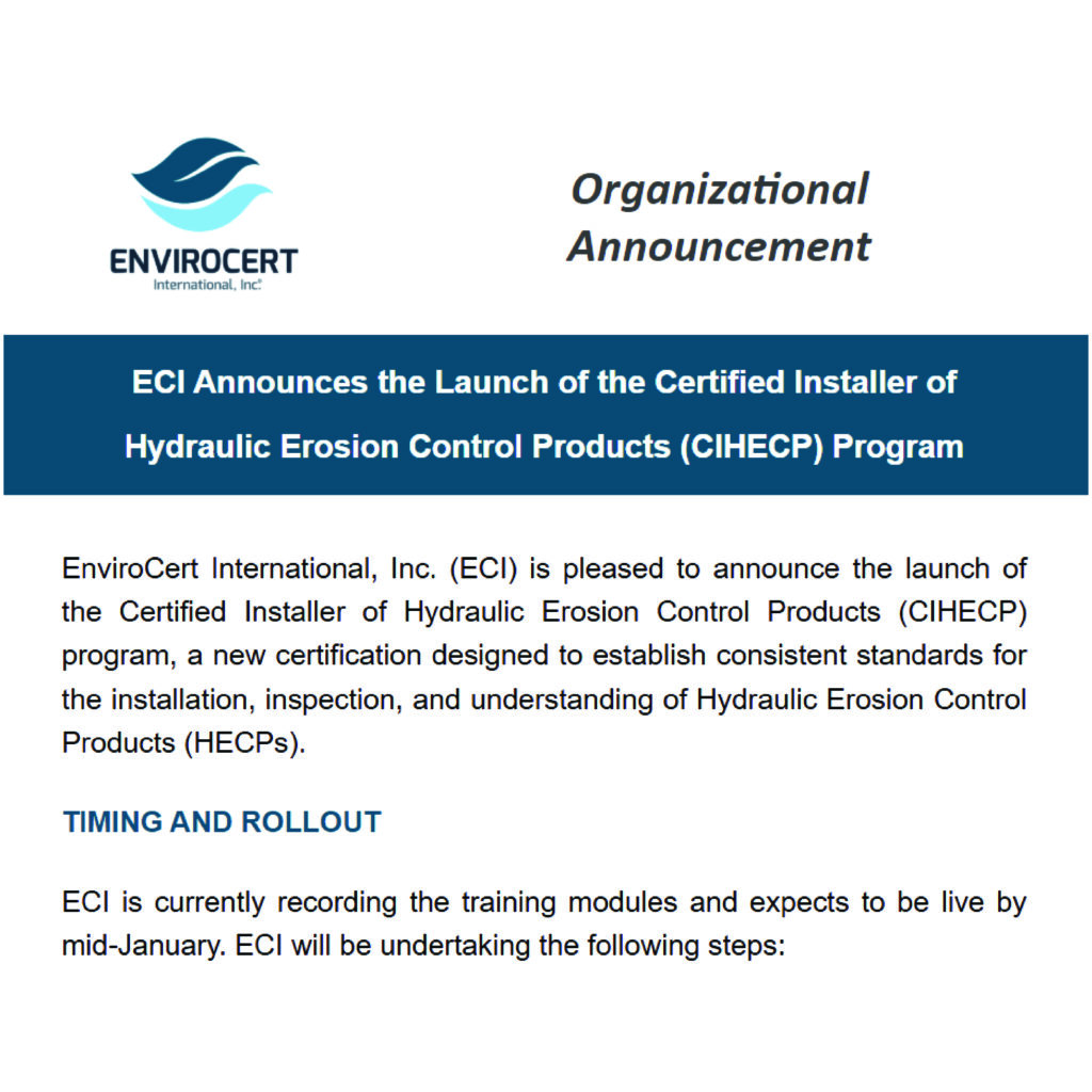News ECI Announces the Launch of the Certified Installer of Hydraulic Erosion Control Products (CIHECP) Program Read More » December 19, 2025